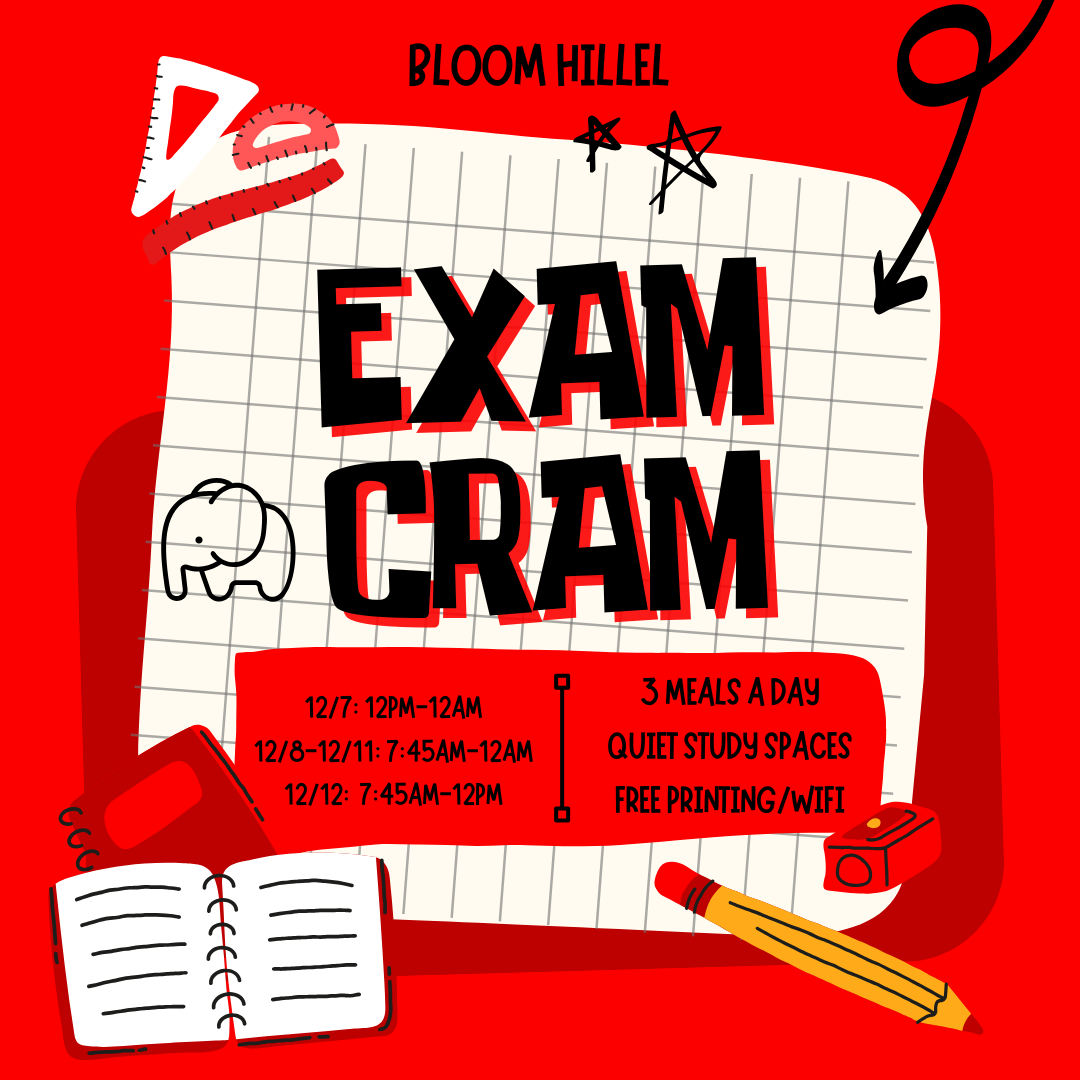 Join us December 7th through December 12th for Exam Cram at Bloom Hillel!