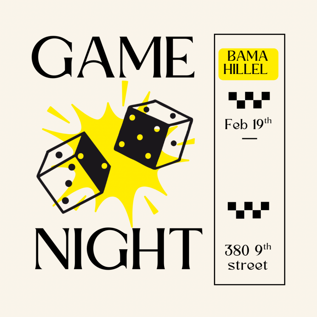 Please join us for Game Night at Bama Hillel on February 19th at 6pm! Sign up using the link below. Can’t wait to see everyone!